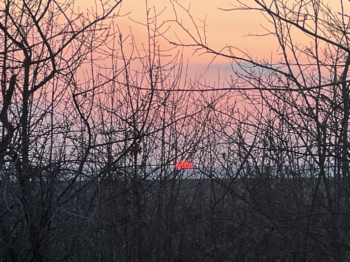 The image depicts a twilight scene, either sunrise or sunset, observed through a dense network of bare tree branches in Varbak, Bulgaria. The sky exhibits a gradient of colors, transitioning from light orange at the top to vibrant pink and cooler lavender-pink tones near the horizon. Faint, wispy clouds are present in the upper sky. A horizontally elongated, intensely red disc, identified as the sun, is visible at the horizon, partially obscured by the foreground foliage. The foreground and midground are dominated by a dark silhouette of numerous intertwined, leafless deciduous tree branches, indicating winter or early spring conditions. Below the sun and the lower branches, a dark, indistinct line signifies the distant ground or a low ridge. No human subjects, animals, or man-made structures are discernible. The scene is static, capturing a natural landscape event.