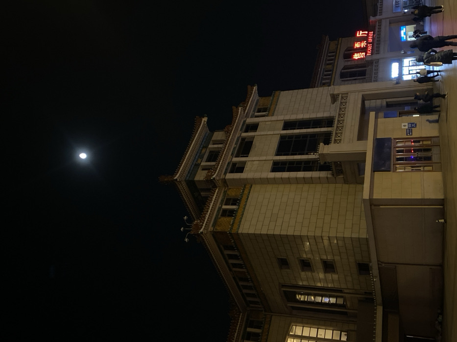 A large, illuminated building with traditional Chinese architectural elements stands against a dark sky featuring a bright moon