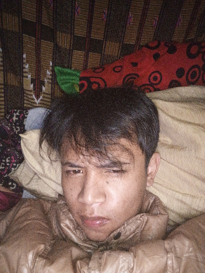 A person lies on a tan pillow, wearing a light brown, shiny jacket. A red pillow with black circles is behind them. Above that is a patterned brown and white tapestry. The person has short, dark hair and looks directly at the camera with a slightly furrowed brow. Their expression is serious. The lighting is dim.