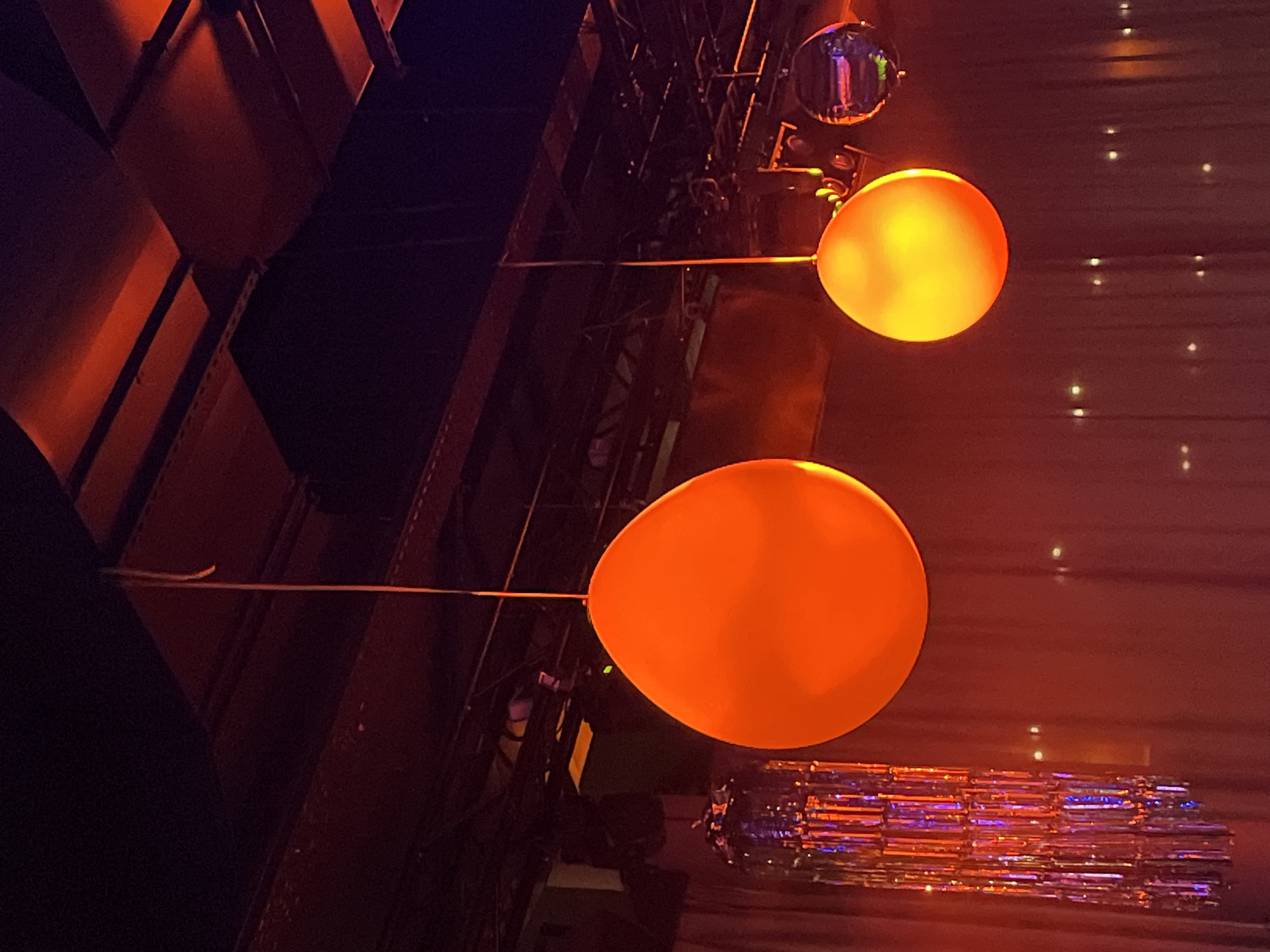 A low-angle, indoor shot taken in Montrond-les-Bains, France, shows two bright orange balloons on strings. They hang from a dark, structural framework above a shimmering, layered, rectangular object with reflective blue and pink surfaces. The background is a reddish-brown, with evenly spaced, small, bright spots. The shot includes structural elements of a building and possible stage equipment.