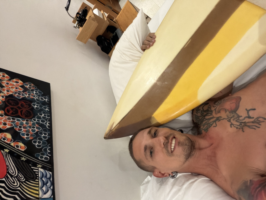 An adult male is observed lying shirtless on a bed in Benoa, Indonesia, smiling towards the camera. He exhibits short hair, light facial stubble, ear plugs, and tattoos on his chest and left arm. A multi-colored surfboard, striped horizontally in brown, yellow, and cream, rests beside him on the white bedding. His right hand is visible resting on the surfboard. The background features a plain white wall adorned with a partially visible, large, abstract art piece displaying colorful patterns. To the upper right, a wooden, tiered shelf unit holds dark objects, including an adjustable lamp.
