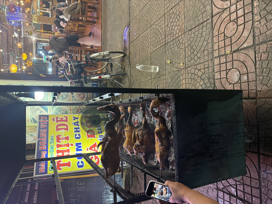 An evening scene in Nam Hoa Lư Ward, Vietnam, depicts an outdoor food preparation area adjacent to a busy restaurant. In the left foreground, a person's hands hold a white smartphone, actively photographing four whole, roasted animals (likely ducks or small pigs) spitted over a bed of glowing coals within a large, rectangular, open-air metal roasting apparatus. The animals are cooked to a golden-brown. Behind the roasting pit, a prominent yellow sign for "NHÀ HÀNG HOÀNG VIỆT" (Hoang Viet Restaurant) advertises "THỊT DÊ" (Goat Meat), "CƠM CHÁY" (Burnt Rice), and "GÀ ĐỒ" (Roasted Chicken), among other items. A small electric fan rests on the ground below the sign. To the right of the roasting area, two bicycles are parked upright on a patterned tiled pavement. Further right, a clear plastic water bottle stands on the pavement, which also features scattered dried leaves. In the background, the brightly lit interior of the restaurant is visible, filled with patrons seated at wooden tables and chairs, engaged in dining and conversation. Decorative lanterns and string lights illuminate the dining area. One adult male, wearing a gray t-shirt and dark shorts, is observed standing and moving within the restaurant's seating area.