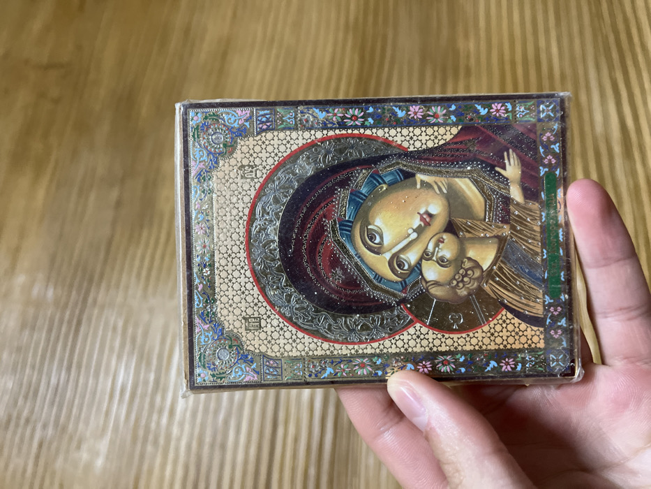 A close-up, eye-level photograph captured in the city of Dolni Chiflik, Bulgaria, depicts a light-skinned left hand holding a small, rectangular religious icon. The icon portrays the Virgin Mary, wearing a maroon head covering and a blue garment, cradling the Infant Jesus, who wears a golden-brown tunic and looks up towards Mary. Both figures are depicted with golden halos and stylized features in a Byzantine-influenced artistic style. The icon's background and border are extensively decorated with gold-colored elements, intricate patterns, and accents of red, blue, and green. Glitter is visible across the icon's surface. The entire icon is encased in a clear plastic film, showing minor reflections and slight creasing around the edges. The hand supports the icon from its left side and bottom, with the thumb, index, and middle fingers visible. The background consists of an out-of-focus wooden surface with light to medium brown horizontal grain patterns.