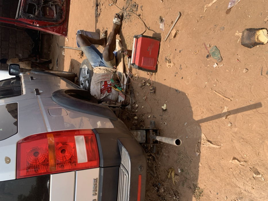 The image portrays an outdoor automotive repair operation situated in Abuja, Nigeria
