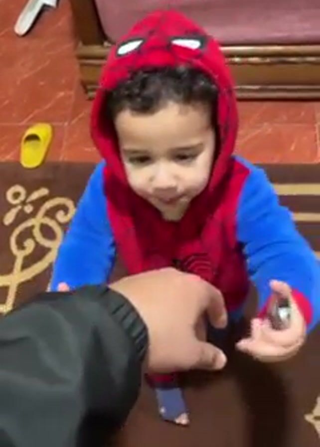 toddler dressed in a Spider-Man costume interacting with an adult's hand. The toddler is standing on a brown patterned rug in a room with a red tile floor. A yellow slipper and another shoe are visible in the background. The adult, wearing a black jacket, holds out a small object to the toddler, who takes it and then seems to give it back to the adult. The adult then offers a wooden stick, which the toddler also takes. The toddler is the central focus of the video.