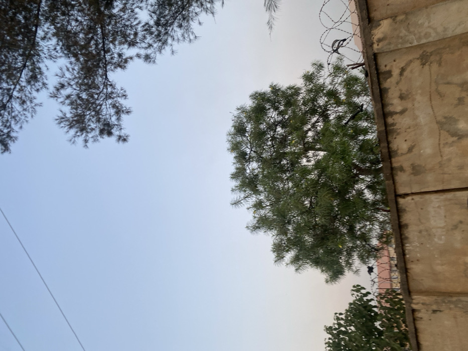 The scene depicts an outdoor environment in Sabon Gari Nassarawa, Nigeria, under a clear, light blue sky suggesting daytime. The foreground features a light brown, weathered concrete or plastered wall extending across the lower half of the image, topped on the right side with coiled concertina wire. Behind the wall, a large tree with dense green foliage, possibly exhibiting subtle yellow blossoms or leaves, occupies the central midground. Additional tree foliage is visible, with a darker-leaved tree branch in the upper right quadrant and a portion of another green-leaved tree on the lower left. Faint reddish-brown rooftops of distant structures are discernible behind the vegetation and wall. Two thin, dark linear objects, consistent with overhead utility lines, traverse the upper left portion of the sky. No individuals, specific actions, or interactions are visible.