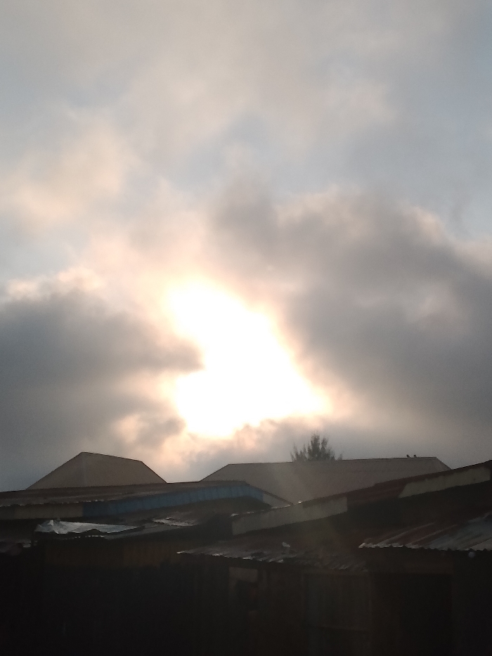 An outdoor scene in Rigasa, Nigeria, depicts a cloudy sky with a prominent, intense bright light source, identified as the sun, positioned in the middle-left, breaking through the overcast conditions
