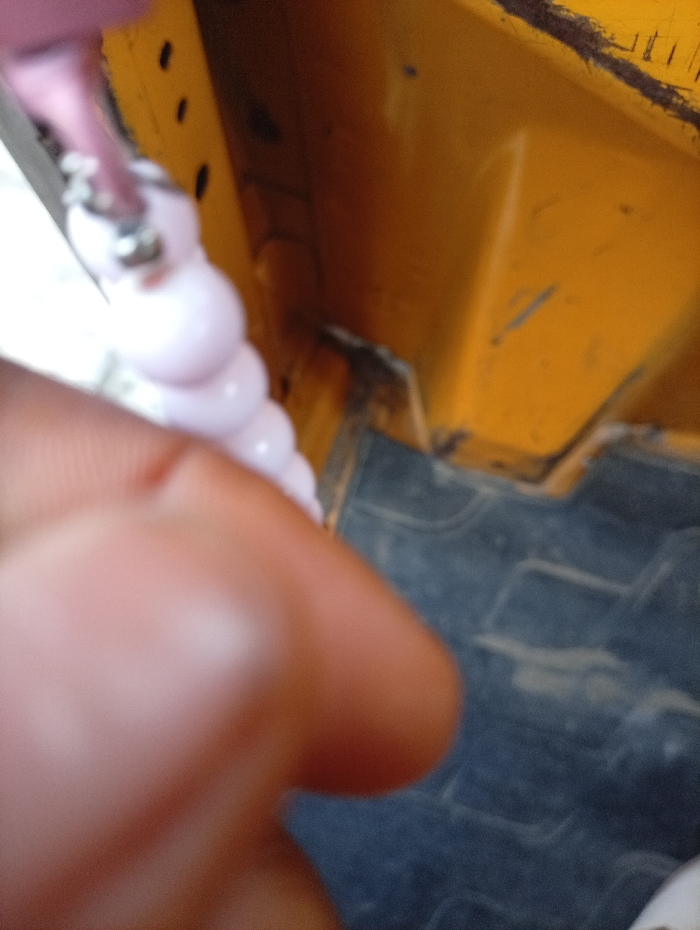 The image displays a close-up view from within the interior of a commercial tricycle, commonly known as a Keke Napep, operating in Lagos, Nigeria. A blurry human finger or thumb occupies the bottom-left foreground. A string of light pink, spherical beads, secured by a silver-colored metal ring, extends downwards from the upper-left, partially obscured by the foreground. The dominant background element is a worn, scratched, and somewhat grimy yellow-orange panel, likely part of the vehicle's bodywork. Below this panel, a dark, textured rubber floor mat with a geometric pattern is visible, showing accumulated dust and wear. The overall scene indicates the functional and utilitarian environment of a public transport vehicle.