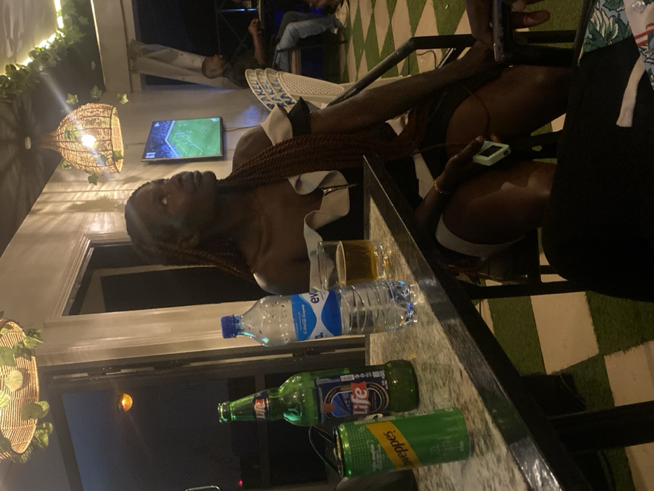 The scene depicts an evening at what appears to be an outdoor or semi-open lounge, bar, or restaurant establishment located in Jos, Nigeria