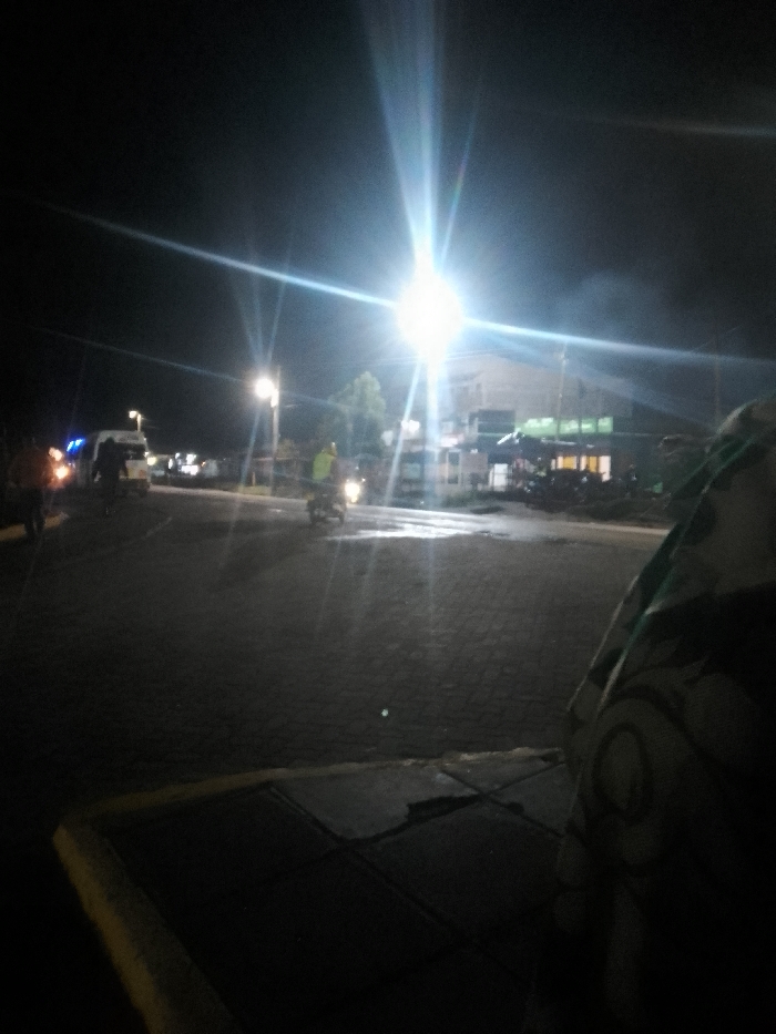 The image depicts a nighttime street scene in Njoro ward, Kenya. In the immediate right foreground, a dark, patterned fabric object is partially visible, obscuring part of the view. Below this, a yellow curb delineates a paved sidewalk constructed from square concrete tiles, which transitions into a darker, wet-looking paved roadway, possibly interlocking concrete blocks. The scene is illuminated by multiple artificial light sources. A prominent, intensely bright streetlamp with significant lens flare dominates the upper mid-right, casting strong light onto the street and surrounding buildings. A secondary, less intense streetlamp is visible further down the road on the left. On the left side of the roadway, a white vehicle with flashing blue lights, consistent with an emergency vehicle, is visible. Adjacent to this vehicle, a dark-clad individual stands. Further left, another individual wears an orange-brown top. In the midground, a person on a motorcycle, wearing a light-colored (possibly yellow or light green) top, faces right, illuminated by the motorcycle's headlight. In the background, on the right side of the road, a multi-story building complex with illuminated windows and green signage is visible. Some trees are present in the left mid-background. The sky is dark, indicating night.