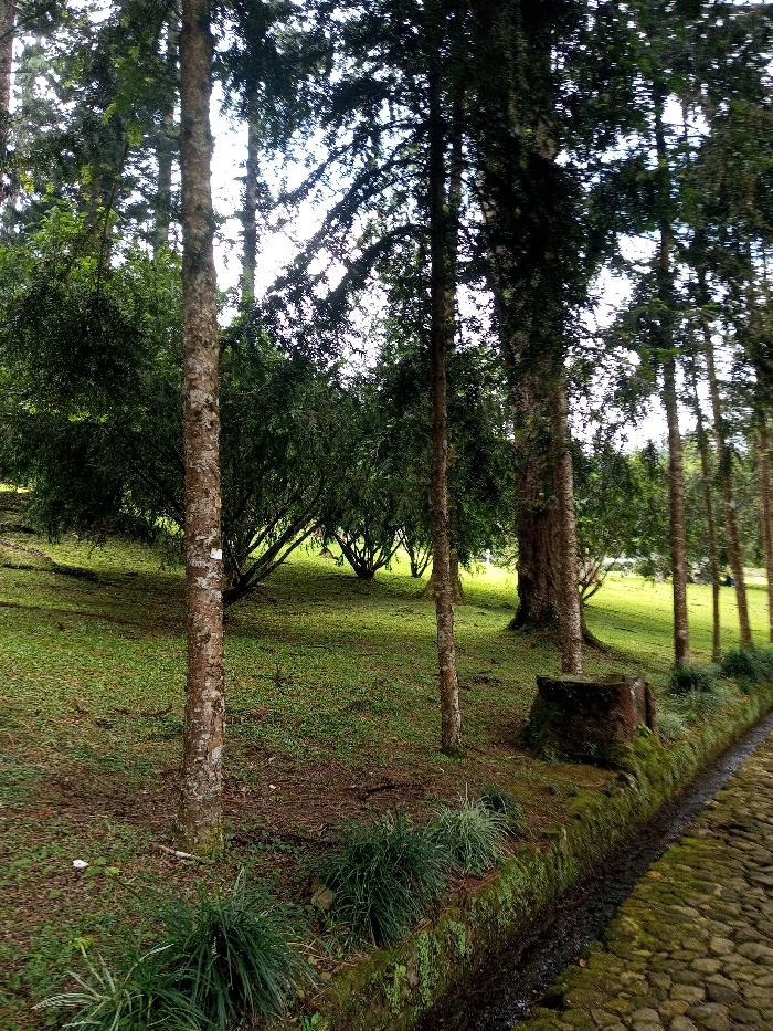 A serene landscape presents a grassy slope dotted with trees. Sunlight filters through the upper canopy. A stone pathway borders the scene, lined with moss-covered walls and interspersed with clumps of green plants. A weathered tree stump adds character to the middle ground. The atmosphere conveys a peaceful, natural setting.