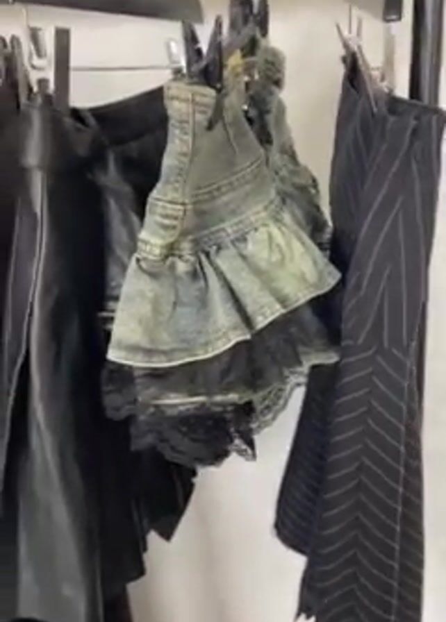 The camera pans across a clothes rack filled with various garments