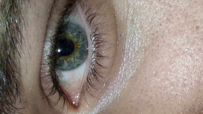 A close-up vertical photograph captures a human left eye, located in Leudelange, Luxembourg