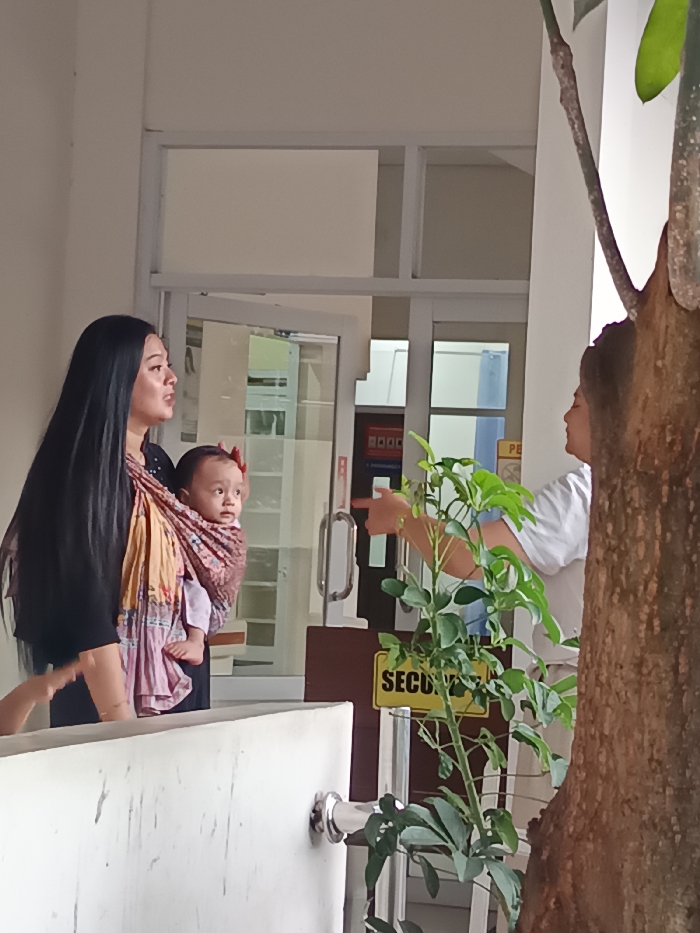 The image displays a scene in Cianjur, Indonesia, within what appears to be a building entrance or a sheltered area. On the left, a female individual with long dark hair, wearing a black top, holds an infant in a patterned fabric baby carrier. The infant, dressed in light clothing and adorned with a red head accessory, faces towards the right. The female's mouth is slightly open, indicating potential speech. To the right, partially obscured by a prominent tree trunk and a green plant, another female individual, wearing a white top, extends her right arm and points with her index finger towards a set of glass double doors centrally located in the background. These doors are equipped with metal handles and lead into an interior space. A yellow sign with the partial text "SECURI" (likely "SECURITY") is visible on a brown counter positioned in front of the doors. A white barrier or railing occupies the lower-left foreground. The scene depicts an interaction between the two adult females, one carrying an infant, at a building's entry point.