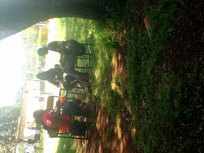Three people sit on chairs in a grassy outdoor area, likely a park. The person closest to the camera wears a red shirt. Another individual behind them wears black. A third person also in black sits further back. They are all positioned under the partial shade of a large tree. A building and more people are visible in the background, suggesting an event or gathering. The sunlight casts a bright glare in the upper left corner of the image.