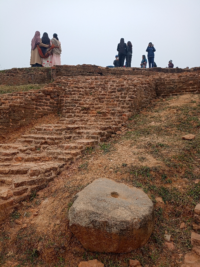 This image depicts the archaeological site of Mahasthangarh in Bogura, Bangladesh, under an overcast sky. In the immediate foreground, a weathered, gray, roughly cylindrical stone object with a central circular bore hole rests partially buried in reddish-brown soil mixed with dry grass. Directly behind it, an extensive ancient brick structure, composed of reddish-brown, eroded bricks, forms a sloped wall that ascends diagonally from the lower left to the upper right of the frame. A series of approximately ten worn, rectangular steps are integrated into this brick structure on the left side. The ground surrounding the brickwork is predominantly reddish-brown earth with sparse patches of green and dry vegetation. On the uppermost level of these ruins, against a light gray, featureless sky, a group of approximately eight individuals is distributed. To the far left, three women are observed from behind, standing closely together. One wears a brown head covering and a long, light brown garment. The central woman has long dark hair and wears a white garment with a floral pattern. The third woman, to the right, wears a light pink garment with a shawl draped over her left shoulder and arm. The central and rightmost women appear to have their arms linked or around each other. To their right, further along the elevated platform, several other individuals are visible. These include two figures in dark jackets standing together, and one person in a dark blue jacket holding an object consistent with a camera or mobile phone up to eye level, seemingly directed towards the scene. Other less distinct figures are partially visible further back on the platform.