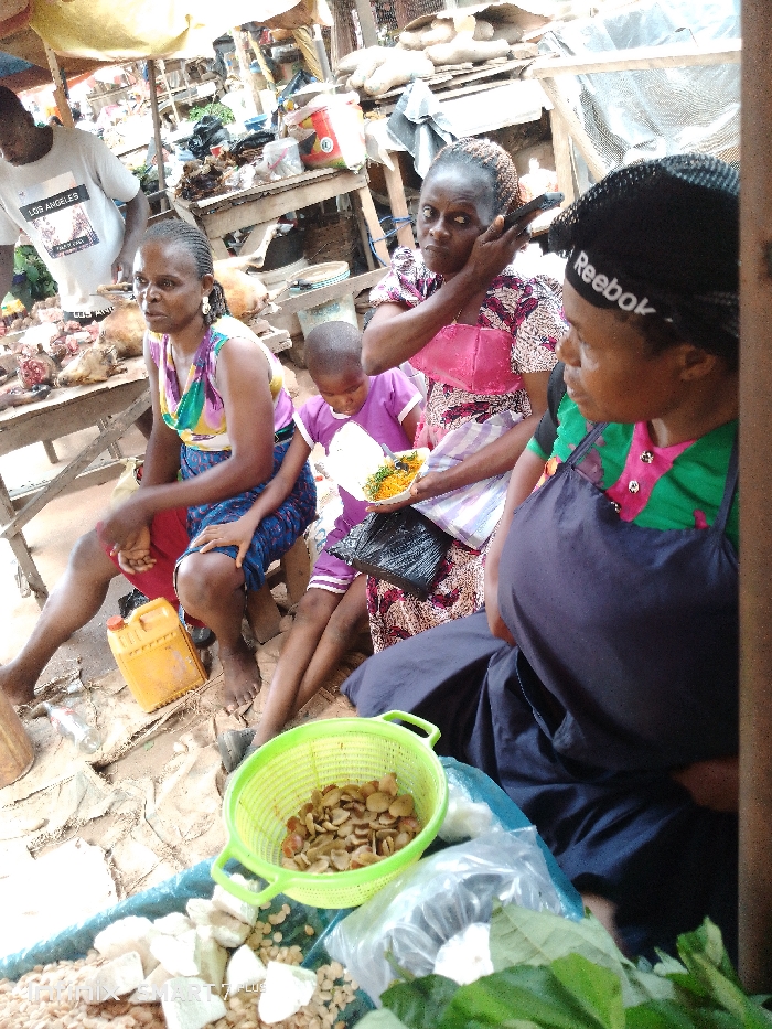 In an outdoor market, three women and a child are pictured. The leftmost woman sits on a surface near a yellow container and a table displaying meat. The child sits in the center holding a styrofoam container of food. A woman wearing a pink-trimmed dress is adjusting something behind her ear, and another woman wearing a "Reebok" hat and a blue apron sits on the right. A green basket of seeds is in the foreground.