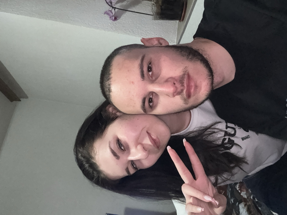 The image depicts two young adults, one female and one male, in an indoor setting within Erma Reka, Bulgaria. The female, positioned on the left, has long dark hair and a light complexion, looking towards the camera with a slight smile. She is wearing a white t-shirt with "GUES" visible on the front and displays a peace sign with her left hand, which has light-colored nails with faint heart designs. The male, positioned in the foreground on the right, has short buzzed hair and a light beard, looking directly at the camera with a neutral expression. He is wearing a black t-shirt. The background consists of a plain, light-colored wall. A wooden beam or molding is visible at the top left corner of the frame. In the upper right background, a potted plant with purple flowers rests on a white shelf or ledge. The scene is illuminated by frontal, artificial light.