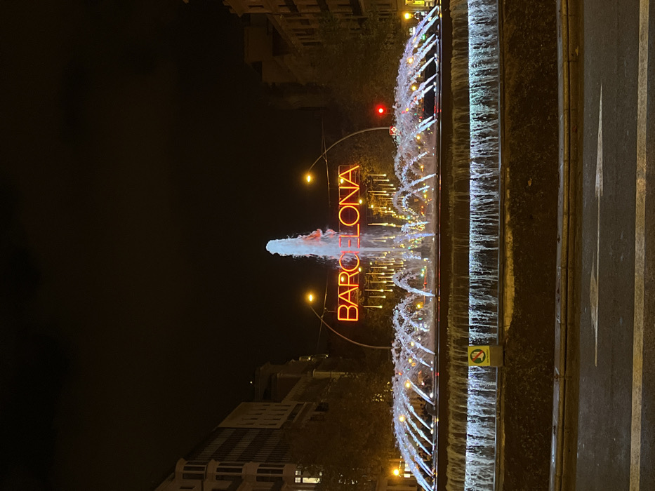 At night, a fountain with illuminated "BARCELONA" lettering stands prominently
