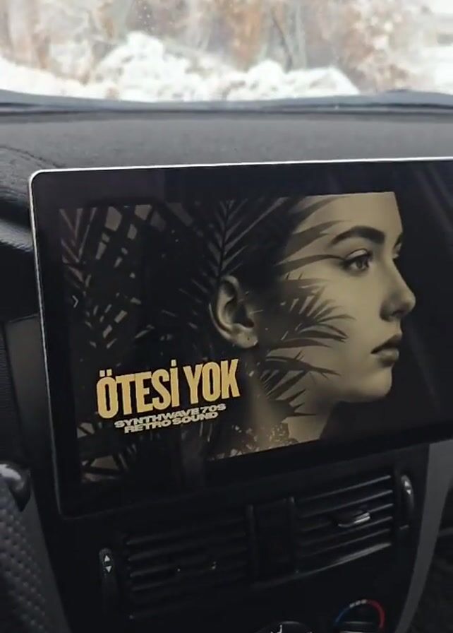 interior of a car driving on a snowy road. The car’s dashboard is visible, featuring a screen playing music with an image of a woman. The weather is snowy, and snow is visible on the sides of the road. An electrical pylon is visible through the windshield. The road surface appears wet or slushy. A person can be seen walking in the distance on the side of the road.