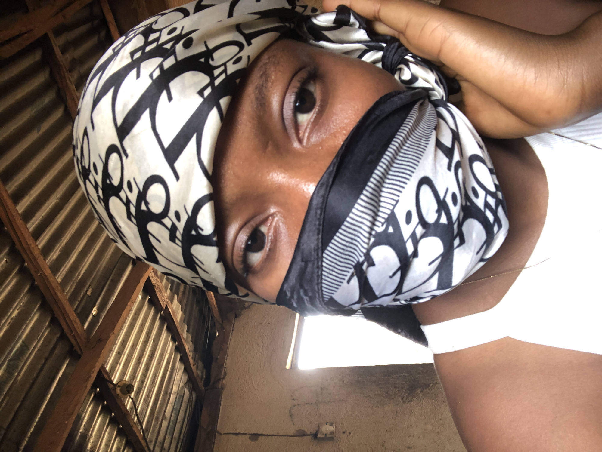 This image displays a close-up indoor portrait of an individual in Jos, Nigeria. The subject, a person with dark skin, is depicted from the forehead to just below the chin, looking directly at the camera. They wear a white sleeveless garment and a black and white patterned headscarf, featuring a 'Dior' logomania-like design. This headscarf also functions as a face covering, obscuring the nose and mouth while leaving the eyes and forehead visible. A thin gold-colored chain necklace is present around the neck. The individual's left hand is visible at the lower right, supporting the chin or lower cheek area. The background reveals an interior space with a corrugated metal sheet roof supported by rustic wooden beams. An empty light bulb socket with visible wiring hangs from one of the beams. The walls are light brown, textured, and show signs of wear. A bright rectangular opening, likely a window or doorway, is visible on the left side, providing significant natural light.