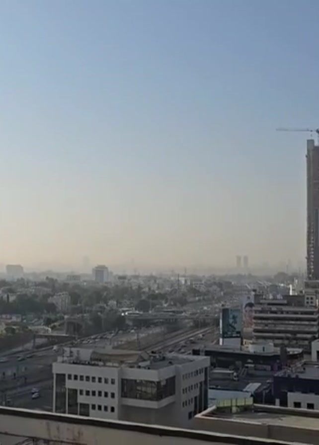 wide, high-angle cityscape on a hazy, sunny day. Several modern skyscrapers are visible, with some under construction as cranes are seen on top. A major highway runs through the scene with cars moving along the road. Lower-rise buildings and trees fill the space between the towers. The air appears slightly polluted, creating a hazy effect in the distance.