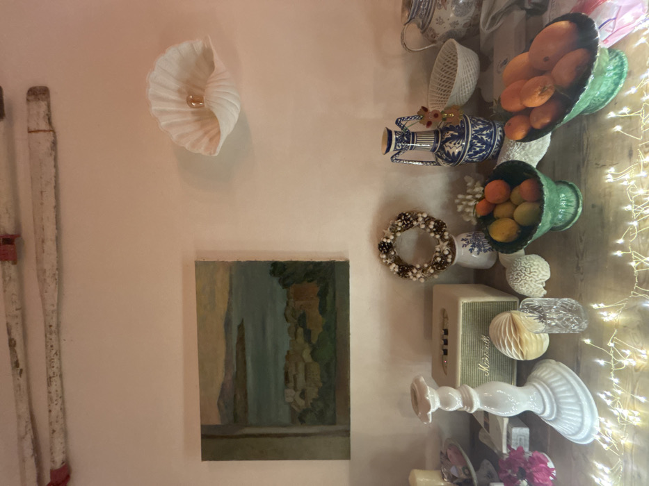 A light pink wall holds an eclectic display. A white, shell-like sconce and an abstract landscape painting hang left. To the right, a collection of decorative items including a blue and white vase, a wreath, a Marshall speaker, and white candlesticks are assembled on a surface. Bowls of fruit and string lights add brightness to the arrangement. A white, distressed wooden object hangs on the far left.