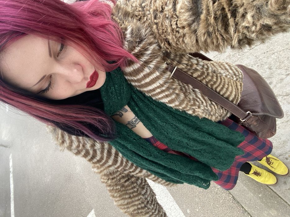 An individual is depicted in a high-angle, downward-looking shot, standing on grey pavement with a partial white line marking, characteristic of a street or pedestrian area in Ulcinj - Ulqin, Montenegro. The subject is a female with long, multi-toned hair, predominantly bright pink and magenta, with darker roots visible. She has dark eyeliner and deep red lipstick. Her attire includes a brown and tan striped faux fur coat, an emerald green knitted scarf with a subtle shimmer, a red and navy plaid garment, black tights, and bright yellow lace-up shoes. A dark brown leather shoulder bag with a silver-colored buckle is worn over her right shoulder. A tattoo consisting of script or lettering is visible on her upper chest/décolletage, partially covered by the scarf. The individual's eyes are cast downward.