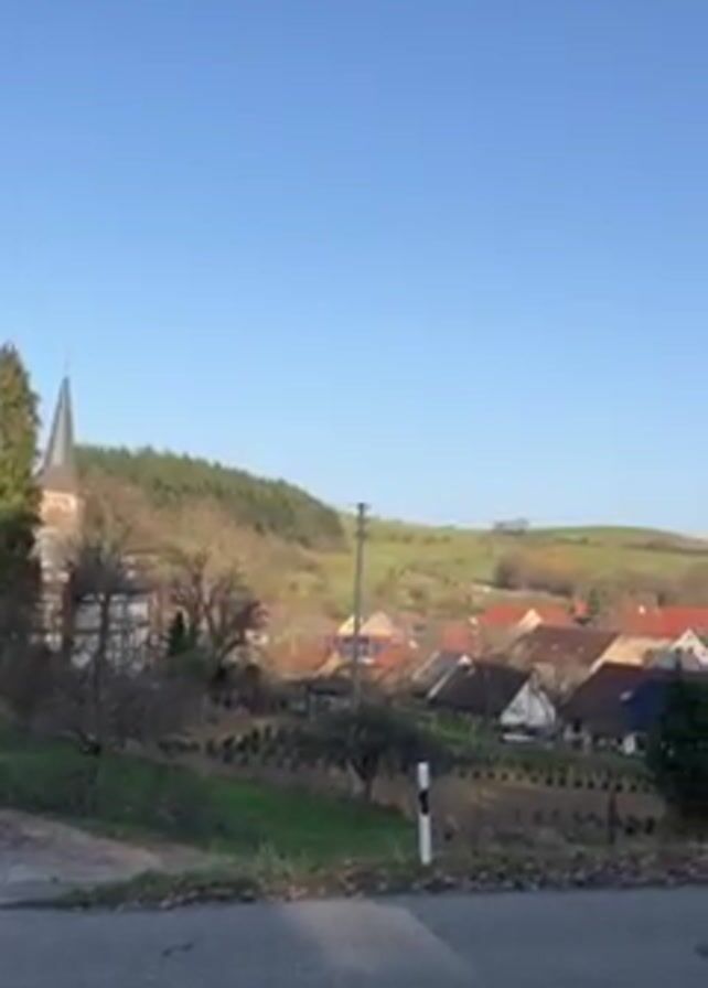 The video presents a daytime view of a small European village nestled in a valley. In the foreground, a paved road stretches horizontally across the frame, with a small, dark, boxy object containing a clay-colored planter sitting on its right side. Beyond the road, the landscape rises gently, dotted with houses featuring predominantly red-tiled roofs. A church steeple is visible on the left, amidst bare trees. A forest covers the hillside in the background. The sky is a clear, cloudless blue. The overall lighting suggests a bright, sunny day, enhancing the natural colors of the scene.