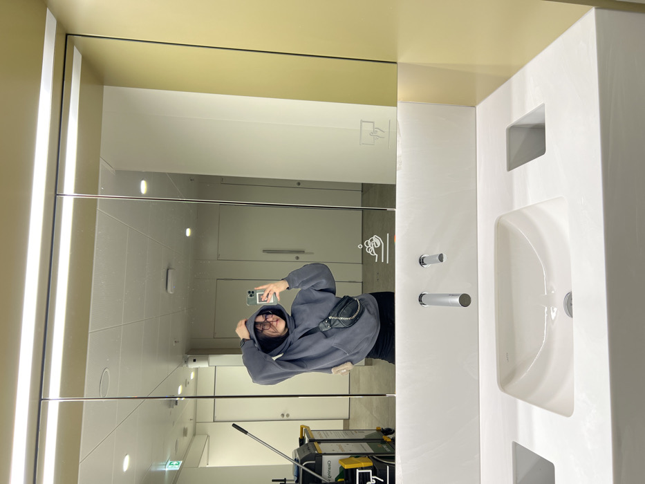 The image displays a modern public washroom facility, stated to be located in Fischamend, Austria. A young adult female is centered in a mirror selfie, captured holding a light-colored smartphone with her right hand. She wears a dark gray hooded sweatshirt with the hood pulled over her head, dark-framed glasses, and black trousers. A black fanny pack with a silver-colored chain is worn diagonally across her chest. Her left hand is raised, subtly adjusting her hood. She exhibits a slight smile. The washroom environment visible in the reflection features light-colored walls and multiple white closed doors, indicative of stalls or utility rooms. On the far left of the reflection, part of a yellow and black cleaning cart is discernible. The foreground of the image shows a white countertop with an integrated rectangular white sink basin. Two chrome-finished fixtures, a faucet and a sensor (likely for soap or hand dryer), are mounted above the sink. A long, horizontal light fixture illuminates the area above the mirror. Handwashing and hand-drying icons are present on the mirror's surface. A solid beige-yellow wall is visible to the right of the mirror frame.