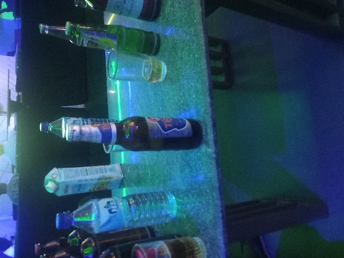 This image depicts a dimly lit interior scene within a commercial establishment in Narayi, Nigeria, resembling a bar or club. The central focus is a speckled table, illuminated by pervasive blue and green ambient lighting, featuring a distinct horizontal green light strip across its surface. Arranged on the table, from left to right, are: a partially visible glass holding amber liquid; a brown glass bottle; a plastic bottled water with a blue cap and "HS" logo; a white carton, possibly containing juice, with "Olives" visible on its side; another plastic bottled water with a green cap; a brown glass beer bottle with a silver cap and a "Tiger" brand label; a clear glass tumbler containing a small amount of amber liquid residue; a green glass bottle; and a brown glass bottle with a "Budweiser" label partially visible. In the blurred background, indistinct human figures are visible behind a dark, elevated structure that appears to be a counter or bar. One figure in the background wears a light-colored, patterned shirt. The floor and lower wall sections of the environment are dark, reflecting the blue and green illumination. No specific actions or interactions are discernible among the blurred figures.