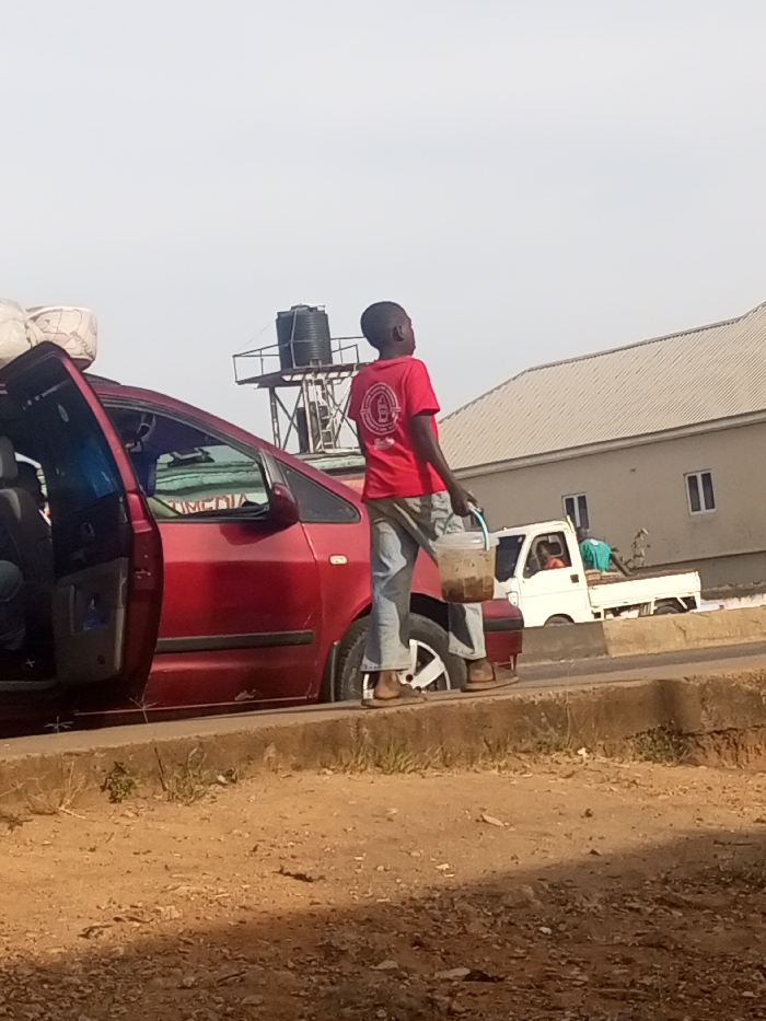 The image depicts a daytime roadside scene in Jos, Nigeria. In the foreground, dry, reddish-brown earth with sparse vegetation transitions to a concrete curb. A young male stands on this curb, oriented towards the right, with his back partially to the camera. He wears a red short-sleeved t-shirt featuring a white circular logo on the back, light blue jeans, and brown sandals. In his left hand, he holds a translucent plastic bucket with a light blue handle, containing a dark, granular or lumpy substance. To the left, a dark red minivan or SUV is parked, with its front passenger door open. White bundled items, possibly luggage, are visible on the vehicle's roof rack. A person's arm and leg are partially visible inside the open door. The word "LINCOLN" is partially legible in white text within the vehicle's interior. In the mid-ground, a white pickup truck with a flatbed is visible on the paved road, behind and to the right of the red vehicle. A person is discernible in the driver's seat of the pickup, and items covered by a light blue tarp are present in its bed. In the background, a dark-colored water tank is mounted on a metal skeletal tower. Further to the right, a single-story building with a light-colored corrugated metal roof and white-framed windows stands under a clear, bright sky.