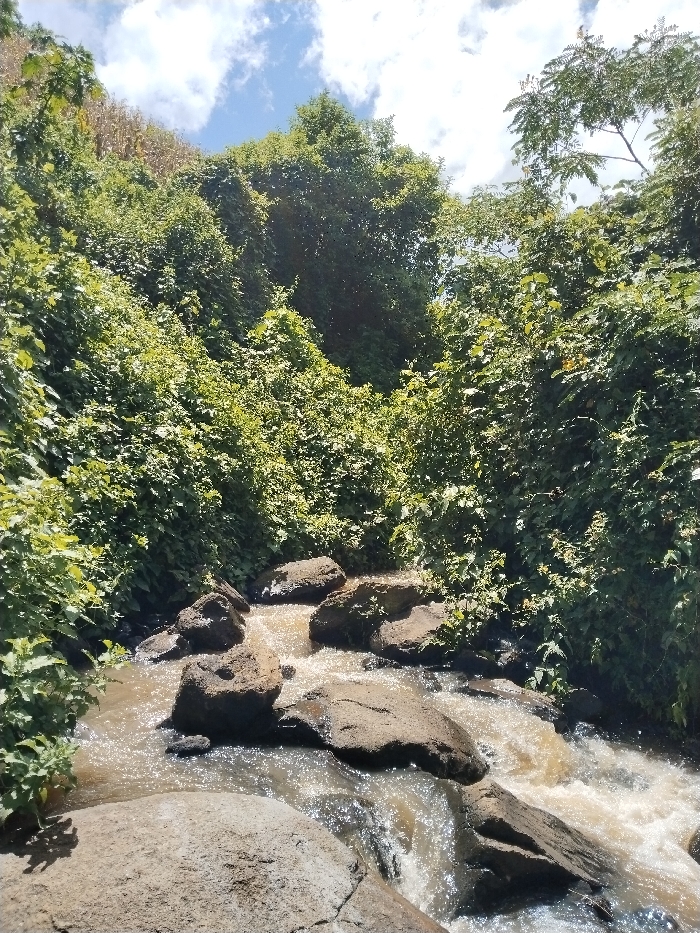 The image depicts a natural outdoor scene in Subukia ward, Kenya, focusing on a rocky stream flowing through dense, lush vegetation under a partially cloudy blue sky. The central subject is a brownish, turbulent stream that originates from the upper left and flows towards the lower right. Numerous dark, irregularly shaped rocks of varying sizes are interspersed within the stream bed, causing the water to cascade and churn, creating white foamy patches and glints of sunlight. A large, flat, light-brown rock occupies the immediate foreground at the bottom left. The stream is flanked on both sides by a steep, heavily vegetated hillside. The dominant vegetation consists of dense, bright green bushes, trees, and intertwining vines, forming a thick canopy that extends upwards and appears to narrow the visible sky. The foliage exhibits various shades of green, with some lighter green leaves indicating new growth or specific plant types. In the upper left background, behind the dense green foliage, drier, lighter brown vegetation (possibly harvested crops or dry grass) is visible on a higher slope. The sky, visible in the upper portion of the image, is clear blue with scattered white cumulus clouds. Sunlight illuminates the scene, casting highlights on the water's surface and the vibrant green leaves. No people, animals, or man-made structures are present within the frame. The scene conveys a sense of wild, natural environment.