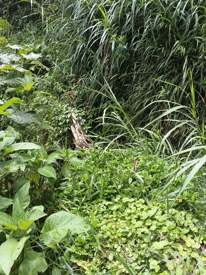 Lush, overgrown vegetation dominates the scene. Tall grasses with linear leaves fill the upper portion. Below, diverse foliage includes broad-leafed plants with visible veins and a dense ground cover of smaller, rounded leaves, punctuated by tiny yellow flowers. A cluster of bamboo stalks rests amidst the green. The image evokes a sense of untamed natural growth and dense plant life.