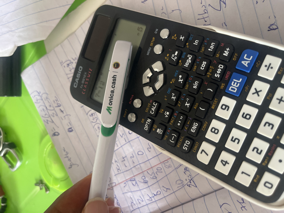 The scene is set in Epe, Nigeria. The image displays an overhead close-up of a desk surface featuring mathematical calculations, a scientific calculator, and a pen held by a hand. A light-skinned hand with a visible fingernail holds a white pen horizontally. The pen has a green band near its tip and is branded "Monica.cash" with a small "MYCC" logo visible on its body. This pen is positioned across the upper section of a black Casio fx-991EX ClassWiz scientific calculator. The calculator's display shows "7-12" on the top line and "=-5" on the bottom line. Various calculator buttons, including numerical keys (0-9), operational symbols (+, -, x, ÷), and scientific functions (sin, cos, tan, log, alpha, shift, optn, calc, solve), are clearly visible. Beneath the calculator and pen, a sheet of white lined paper from a notebook contains handwritten mathematical notes, including formulas (e.g., "b = Σ(x-x̄)(y-ȳ) / Σ(x-x̄)²" and "a = ȳ + b x̄"), and a table with columns for "x", "y", and "x-x̄" containing numerical entries such as "50, 60, 65, 70, 80" and "-4, -2, 0, 2, 4". In the upper left background, a blurred bright green surface is visible, along with a metallic object resembling a key ring component. A crumpled piece of white paper is in the upper right background.