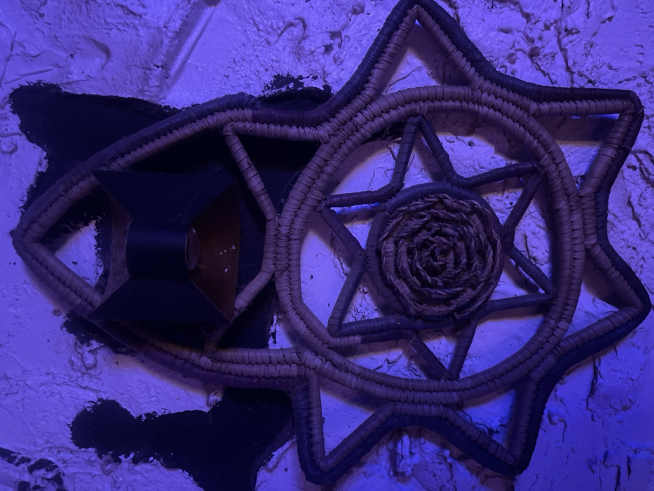 A rustic wall fixture blends a woven starburst design with a modern sconce. The starburst is constructed from intertwined natural fibers, featuring a tightly coiled rosette at its center. Its six points are sharply defined, creating a visually striking pattern. Attached to the left is a dark, angular sconce, providing illumination against a textured, off-white wall bathed in a blueish glow. The wall's uneven surface contrasts with the clean lines of the fixture.