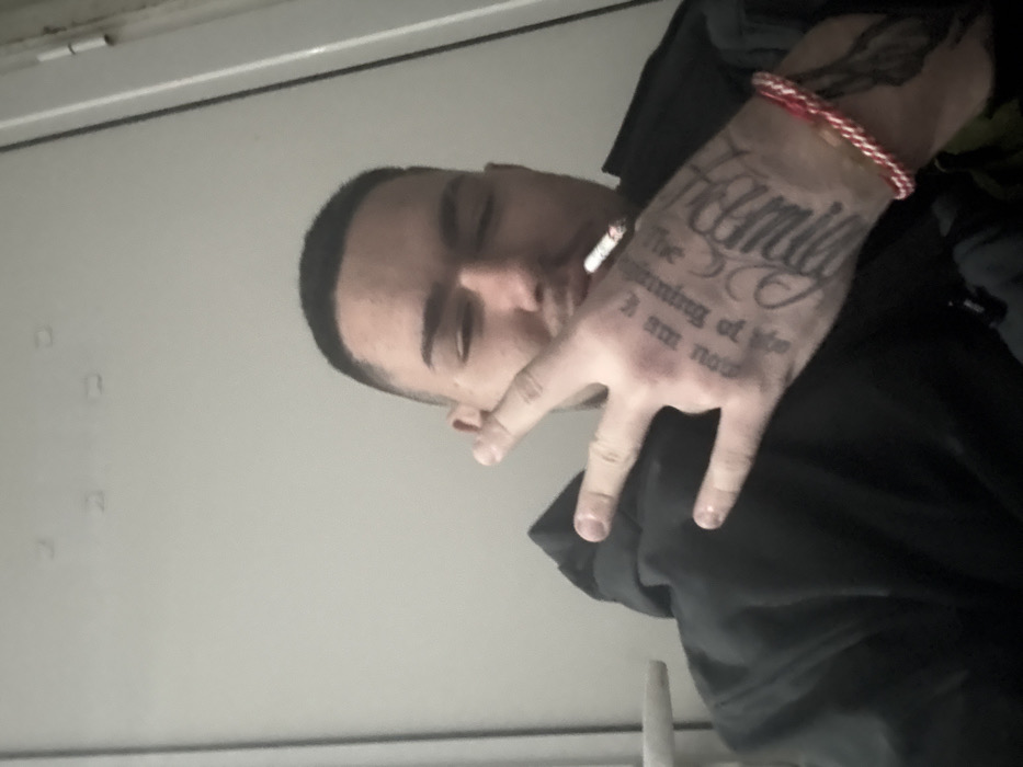 A male subject is depicted in a close-up, indoor setting within Yambol, Bulgaria. He has a short dark haircut and light facial stubble, wearing a dark hooded sweatshirt. A lit cigarette is held in his mouth, angled slightly to his right. His left hand is raised, displaying a gesture where the thumb, ring, and pinky fingers are bent, and the index and middle fingers are extended upwards. The back of this hand is extensively tattooed with script, prominently featuring the word 'Family' and additional text. A red and white braided bracelet is present on his left wrist. The background features a plain light-colored wall. A section of a white door or door frame with a visible hinge is observed on the right. Small, unidentified fixtures are attached to the upper left wall, and a white cylindrical object is partially visible on the far left.