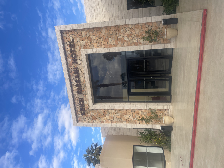 The image depicts the main entrance facade of the Kenzi Rissani Hotel, located in Errachidia, Morocco, under a partially cloudy blue sky. The building's central section features a rectangular stone-clad facade, composed of irregular light brown and tan masonry, framed by smooth, light-colored (likely travertine or similar stone) rectangular columns and lintels. Above the main entrance, the words "KENZI RISSANI HOTEL" are affixed in dark, capital letters. The entrance itself consists of multiple large, clear glass panels, forming double doors, which reflect palm trees and the sky from the opposite side. To the left of the main entrance, a section of the building is finished in a smooth, light beige material, with a prominent glass display window. The ground leading up to the entrance is paved with light-colored, possibly beige, tiles or stone slabs. A red linear object, possibly a rolled-up mat or decorative strip, is visible horizontally across the bottom of the frame on the ground. Two potted plants, each containing a small, leafy tree, flank the main glass entrance. A dark, possibly black, waste receptacle or planter is situated near the right potted plant. Additional green foliage is visible along the base of the building sections to the left and right of the main entrance. No individuals are visible in the scene.