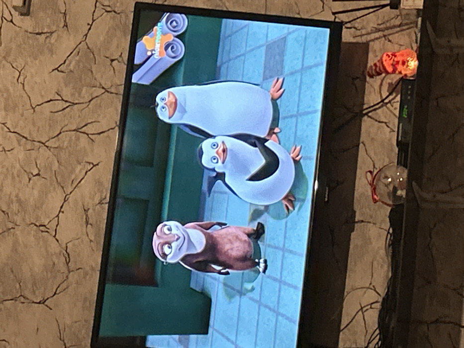 The image displays an indoor scene focused on a television. The specific location within Trakiya, Bulgaria, cannot be determined from the visual evidence. The television screen, which is dark-framed, shows animated content featuring three characters: a brown, bipedal, otter-like creature (Marlene) standing on the left, a smaller, stout penguin (Private) positioned centrally, and a larger, taller penguin (Skipper) on the right. All characters face towards the viewer. The background on the screen depicts a light blue tiled floor and a dark green wall or furniture piece, with a "Nicktoons" logo visible in the upper right corner of the display. Below the television, on a dark mantelpiece or shelf, three distinct objects are present: a clear spherical ornament with a red bow, containing small internal details; a small red, textured, conical decoration emitting an orange glow; and a reed diffuser. Dark wires are visible behind these objects. The wall behind the television and mantelpiece is covered with patterned wallpaper, light beige or tan in color, featuring a prominent, dark, intricate branching design resembling cracks or veins.
