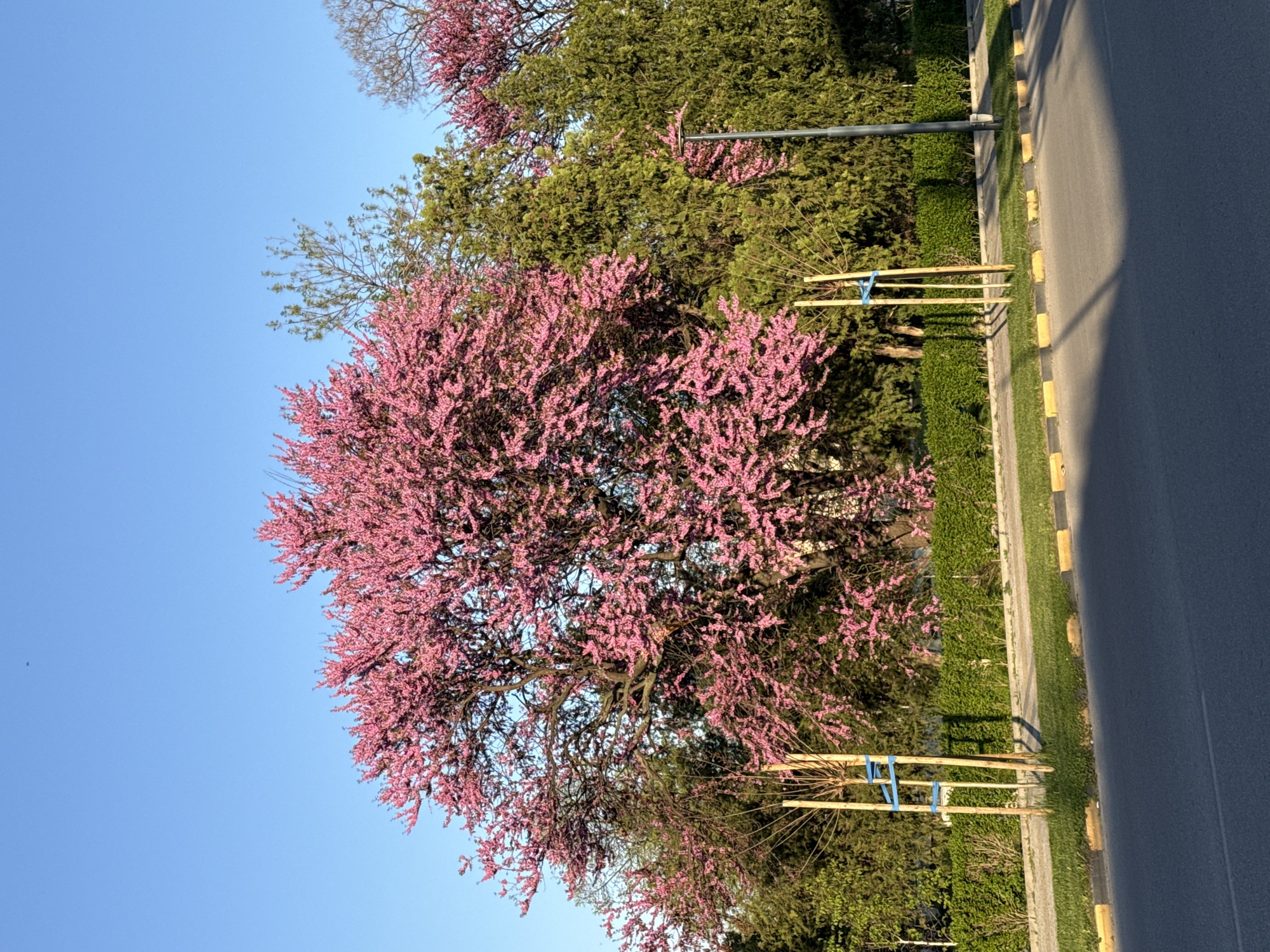 A street in Septemvri, Bulgaria, is depicted on a clear day. On the left, a tree with vibrant pink blossoms stands out against a blue sky. Beside it, other trees with green foliage fill the background. A hedge runs parallel to the street, with young trees staked for support. The gray asphalt road has a curb marked with alternating yellow and gray sections. The right side of the road is in shadow. No people or interactions are visible.