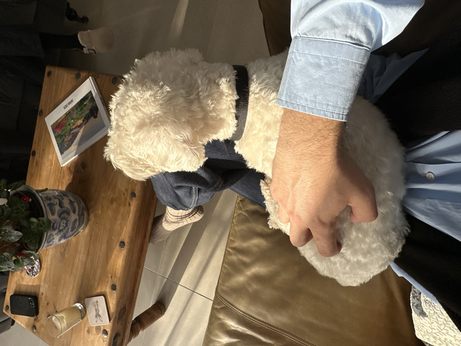The image displays an indoor scene located in the city of West Suffolk, United Kingdom. A light-skinned individual, partially visible, is seated on a tan leather sofa. This individual wears a light blue collared shirt over a dark garment and dark denim trousers. Their right hand, resting on the back of a white, curly-haired dog, is visible. The dog, wearing a dark collar, sits on the individual's lap, facing away from the camera. A rectangular wooden coffee table with metal stud detailing occupies the center of the frame. On the table are a dark-colored smartphone, a blue and white ceramic pot containing a green plant with small white flowers and a red mushroom ornament, a clear glass with a light-colored liquid on a dragonfly-patterned coaster, and a book titled "JAPAN 2023" with a landscape image on its cover. Below the table, a second individual's lower legs and feet are visible; they are wearing dark trousers, light-colored ribbed socks, and light-colored slip-on shoes, resting on a light-colored tiled floor. Strong natural light illuminates the scene, casting defined shadows on the floor and objects.