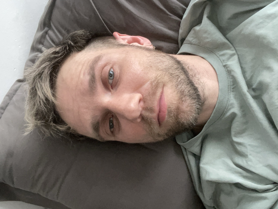 A close-up shot depicts a person lying on a gray pillow, wearing a light green shirt. The individual's face is angled towards the camera, revealing light blue eyes and a short, light-brown beard. Their hair is short and styled upwards, with light-gray highlights. The person's expression is relaxed and slightly suggestive of a smile. The background is muted, with a hint of a white wall visible.