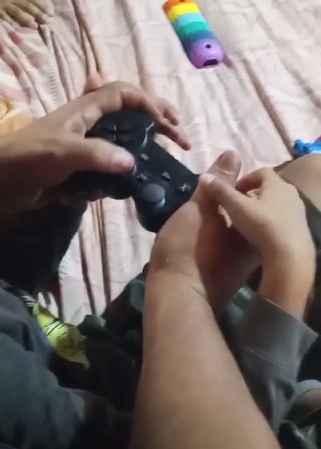 A close-up video shot indoors shows an adult and a child on a bed, both holding a black Playstation controller. The adult’s hands grip the controller while the child’s smaller hand is visible near the buttons, appearing to be interacting with the controller as well. Other children are on the bed in the background. A colorful toy is placed on the pink patterned bed sheet. The adult wears a dark-colored shirt, and the child is wearing grey clothing with camouflage pants. The audio appears to feature music.