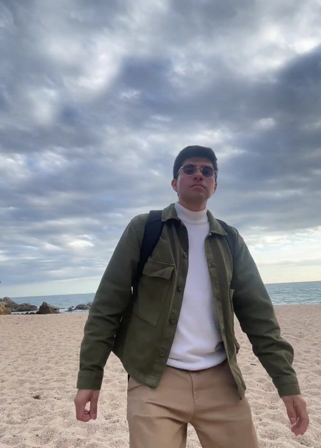 A man stands on a sandy beach with his hand outstretched towards the camera. He is wearing round sunglasses, a white turtleneck sweater, an open green jacket, tan pants, and brown shoes. He also has a black backpack on his back. The sky above is filled with grey clouds, and the ocean is visible in the background. The camera pans upwards, showing the man walking along the beach while waving to the camera. He then stops and looks out at the ocean.