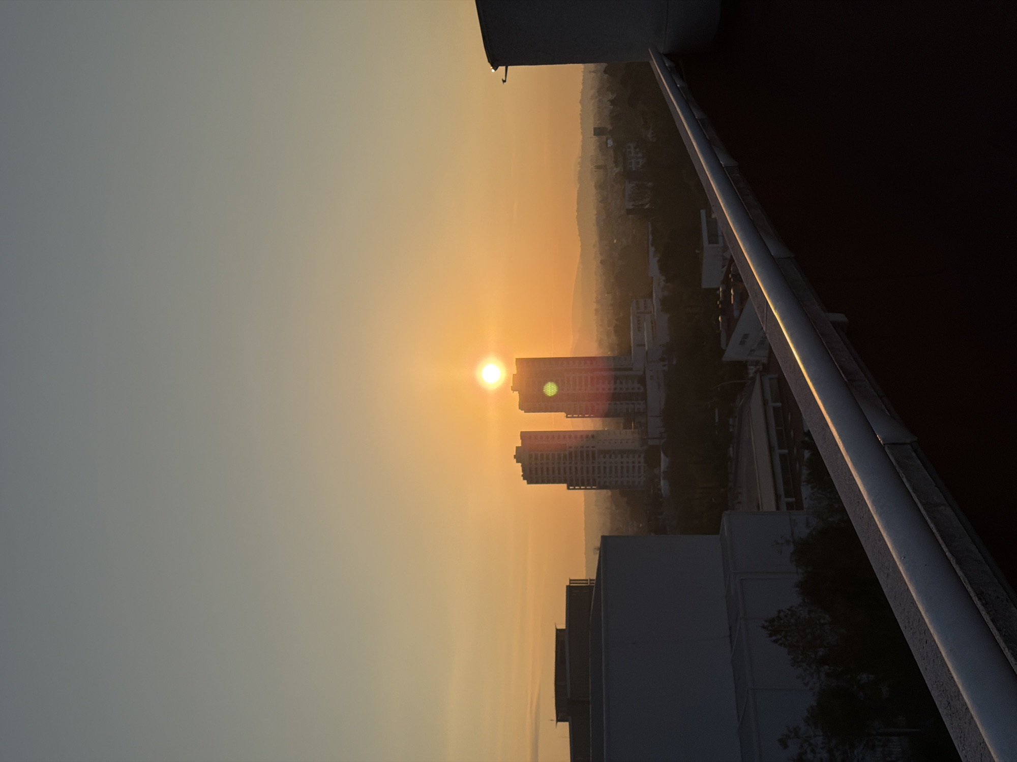 This image presents an elevated view of the city of Puebla, Mexico, during either sunrise or sunset. The sky exhibits a gradient, transitioning from a luminous orange-yellow at the horizon, where the sun is a distinct, bright orb, to a lighter, hazy gray-blue in the upper sky. The sun's direct light creates a prominent, vertical reflection on the facade of the multi-story tower positioned to the right of the sun. A second, similar tower stands immediately to the left, largely silhouetted. Further left, a large, dark, rectangular building with a flat roof is partially visible. The urban landscape extends into the midground, characterized by a dense array of buildings and vegetation partially obscured by atmospheric haze, with distant hills or mountains forming a faint outline on the horizon. In the immediate foreground, a dark, sloped architectural roof element occupies the lower right quadrant, featuring a light-colored pipe or railing that catches the warm sunlight. A dark vertical structure partially frames the scene on the far right. No individuals, explicit actions, or interactions are present.