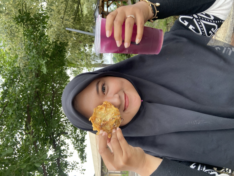 A young adult female is depicted outdoors in Kalitengah, Indonesia. She wears a black hijab and a black long-sleeved garment featuring white patterned cuffs. Her left hand holds a single, round, golden-brown fried vegetable fritter, positioned directly over her left eye. Her right hand grasps a clear plastic cup containing a purple liquid and a black straw. A ring adorns her right ring finger, and a gold-toned charm bracelet is present on her right wrist. She exhibits a direct, smiling gaze toward the camera. The background consists of dense green foliage from trees, a light-colored building partially visible to the far left, and a partially visible wooden gazebo structure to the right.