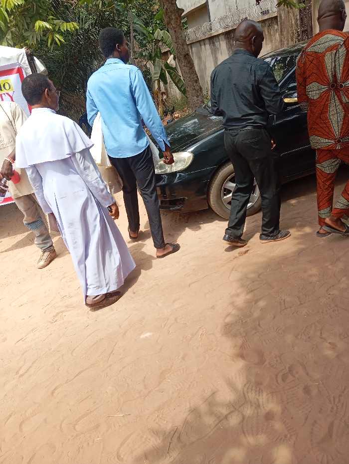 The image depicts an outdoor scene in Okpatu-Ukehe, Nigeria, under bright sunlight, with five individuals and a vehicle on an unpaved, sandy pathway. From left to right: 1. A partial view of an individual in a light-colored garment, holding a red object near a white banner fragment displaying "MO" and "ITY" in red text. 2. An adult male wearing a white clerical-style robe with a distinct shoulder cape and dark brown shoes, appearing to be slightly stooped and facing towards the right. 3. An adult male in a light blue long-sleeved button-down shirt, dark trousers, and brown sandals, facing away from the viewer, moving towards the right. 4. An adult male in a black long-sleeved shirt, black trousers, and dark shoes, standing by the front passenger side of a dark-colored (likely black or dark green) sedan. He is also facing away from the viewer, oriented towards the right. 5. A partial view of an adult male in an orange and brown patterned traditional Nigerian attire, with dark sandals, also facing away from the viewer towards the right. The sedan, possibly a Toyota Corolla, is visible from its front right quarter. The ground consists of light brown, loose soil or sand, covered with multiple footprints and shoe impressions. In the background, green tropical foliage is visible alongside a light-colored building wall topped with barbed wire, and a tree trunk. The scene is brightly lit, indicating clear weather, with distinct shadows cast on the ground. The individuals appear to be part of a group, moving or standing together.