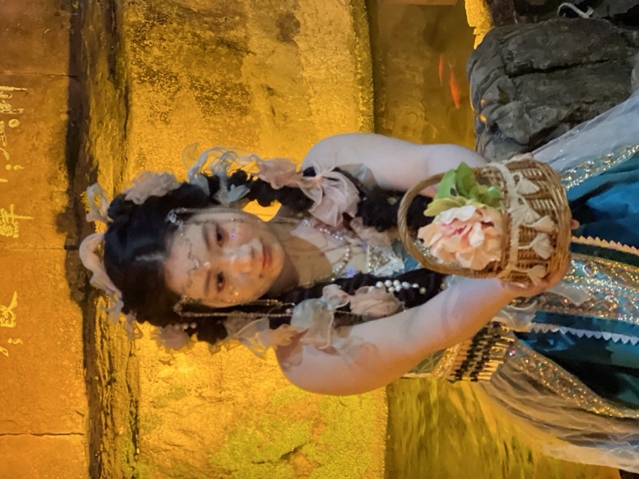 The scene, located in Yuzhong District, China, depicts a young East Asian female, centrally positioned, adorned in elaborate theatrical attire. Her dark hair is styled into two prominent braids, decorated with multiple light-colored fabric bows and intricate silver-toned head jewelry, including a forehead piece with dangling elements. Her face features glitter makeup and small facial adornments. She wears a multi-layered dress primarily in teal and light-colored fabrics with shimmering details, complemented by a multi-strand pearl necklace. She holds a small, woven wicker basket, adorned with tassels and containing artificial light pink flowers and green leaves, presenting it forward with both hands. Her gaze is directed downwards towards the basket. The background consists of a rough-textured wall, intensely illuminated with a golden-yellow light, featuring faint dark Chinese characters in the upper section. To the right, a dark body of water reflects the golden light and contains several orange fish. Adjacent to the water, dark, irregular rock formations are visible. The entire setting is artificially lit, suggesting a staged or exhibit environment.