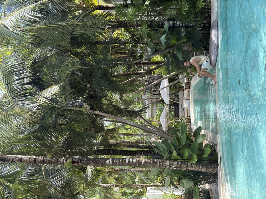 A man stands by a blue pool with palm trees overhead