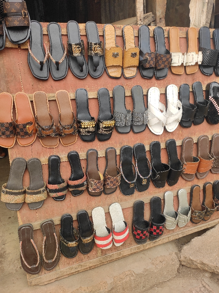 - "The image displays approximately 60 to 70 pairs of assorted sandals and slippers arranged on a multi-tiered, reddish-brown wooden display stand, consistent with a market or street stall setup in Ado, Nigeria" by FM-HInS92, licensed under CC BY 4.0